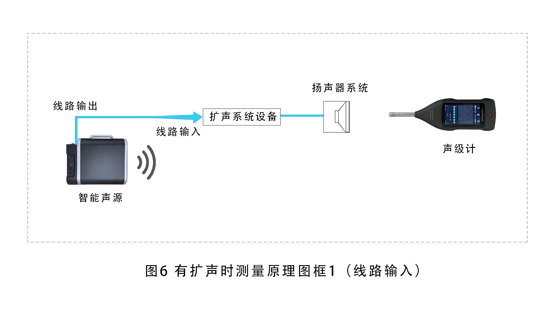 如果被測場所內(nèi)擴(kuò)聲系統(tǒng)不含系統(tǒng)傳聲器而是直接通過播放器播放音頻,則將智能音箱中線路輸出的電信號輸入至擴(kuò)聲系統(tǒng)的線路輸入。測試信號通過擴(kuò)聲調(diào)音臺線路輸入擴(kuò)聲系統(tǒng),經(jīng)擴(kuò)聲系統(tǒng)使揚(yáng)聲器系統(tǒng)發(fā)聲,由聲級計按相關(guān)標(biāo)準(zhǔn)要求測量擴(kuò)聲系統(tǒng)和聲學(xué)場所的各項指標(biāo)。