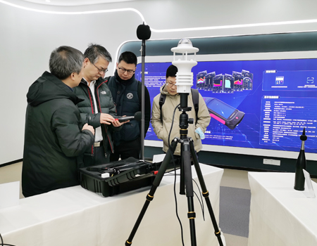 毛玉如副站長一行首先參觀了公司戶外試驗區噪聲源追蹤、定位、識別系統,測試人員現場演示了噪聲定位、鳥叫蟲鳴識別等公司研發的最新科技產品。熊明華總經理介紹了公司參與全國“寧靜小區”建設試點工程的實際成效和經驗。
